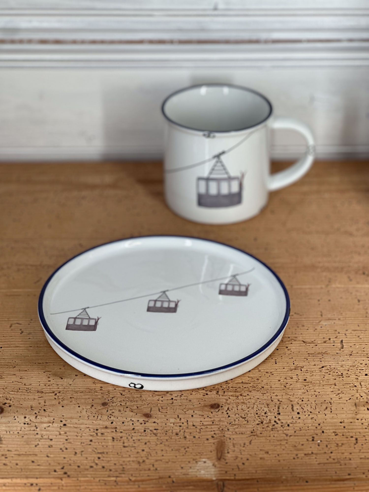 Das Keramikgeschirr im Emaille-Look hat einen blauen Rand und gewollte „Rostflecken“.